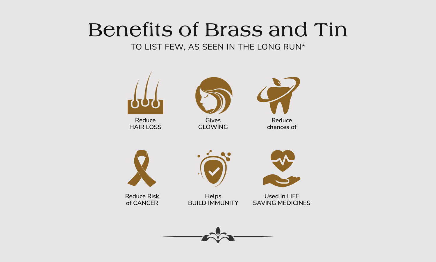 ▸ Brass also helps pacify pitta (burning sensations, aggression), increases hemoglobin count, and improves the general condition of your skin.