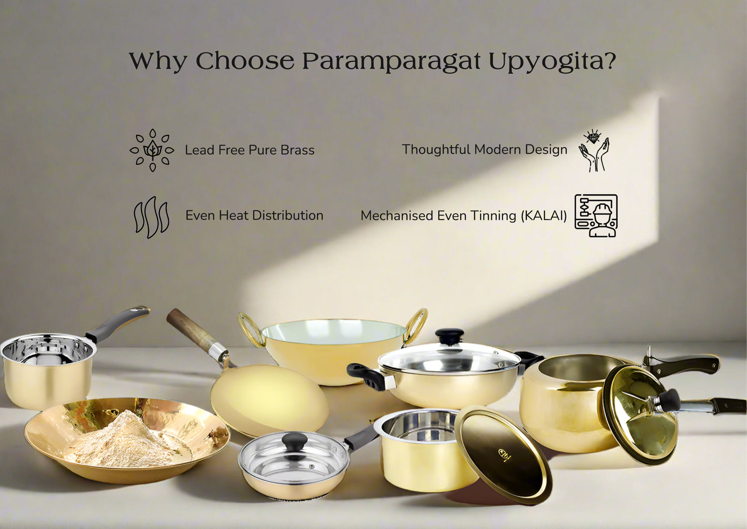 हमने, परमपरागत यूपीयोगिता में, आपके लिए प्रेम के इतिहास और भविष्य दोनों का जश्न मनाने के लिए पीतल के बर्तनों की एक विशेष श्रृंखला तैयार की है, और यह बताया है कि आप हमारे लिए कितना मायने रखते हैं। हम उत्पादों की एक श्रृंखला पेश करते हैं जो न केवल उपहार होंगे बल्कि प्यार का प्रतीक भी होंगे जिसे हमेशा संजोकर रखा जाएगा, इसलिए अपने विशेष दिन का जश्न मनाने के लिए लक्जरी उपहारों के हमारे संग्रह के अलावा और कुछ न देखें। इन बर्तनों के उत्पादन के पीछे मूल विचार हमारे पूर्वजों की विरासत को वापस लाना है जिसके माध्यम से हमें संस्कृति और परंपरा की भूमि के रूप में जाना जाता था। हम समझते हैं कि आधुनिक धुनों के साथ चलते हुए अपनी विरासत के मूल्य को कैसे संरक्षित किया जाए।