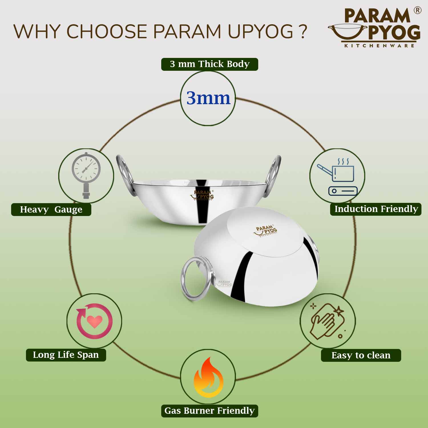 പ്രീമിയം ഗുണമേന്മയുള്ള സ്റ്റെയിൻലെസ് സ്റ്റീൽ ഉപയോഗിച്ച് നിർമ്മിച്ച പരം ഉപയോഗ് ഇൻഡക്ഷൻ ബോട്ടം ഡീപ് കഡായി/കടായി , താപത്തിന്റെ ഏകീകൃത വിതരണവും ദീർഘായുസ്സും ഉറപ്പാക്കാൻ കട്ടിയുള്ള ശരീരത്തോടെയാണ് രൂപകൽപ്പന ചെയ്തിരിക്കുന്നത്. 100% ഫുഡ്-ഗ്രേഡ് സ്റ്റെയിൻലെസ് സ്റ്റീൽ പാകം ചെയ്യുന്ന ഭക്ഷണത്തിന്റെ പോഷകാഹാര മൂല്യം സംരക്ഷിക്കുന്നു. ഇടത്തരം തീയിൽ നിങ്ങളുടെ ഭക്ഷണം പാകം ചെയ്ത് ഇന്ധനം ലാഭിക്കുക, ഇത് നിങ്ങളുടെ അടുക്കളയിലെ ഇന്ധനക്ഷമതയുള്ള പാത്രമാക്കി മാറ്റുക. വെൽഡിഡ് ഹാൻഡിലുകളുടെ ഉപയോഗം, പരമ്പരാഗത റിവേറ്റഡ് ഹാൻഡിലുകൾ ഒഴിവാക്കി, കടായി വൃത്തിയാക്കുന്നത് പൂർണ്ണമായും തടസ്സരഹിതവും ശുചിത്വവുമുള്ളതാക്കുന്നു; ഭക്ഷണം ഹാൻഡിലിനുള്ളിൽ കുടുങ്ങിക്കിടക്കുന്നത് മൂലമുണ്ടാകുന്ന ശല്യപ്പെടുത്തലുകളൊന്നുമില്ല! മനോഹരമായി ശൈലിയിലുള്ള കഡായി ഏത് അടുക്കളയിലും അതിന്റെ സ്റ്റീൽ നിറവുമായി നന്നായി യോജിക്കുന്നു.
