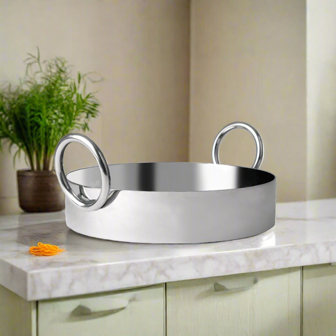 Param Upyog Jalebi/Ghewar Kadhai, built using premium quality stainless steel, is designed with a thick body to ensure uniform distribution of heat and long durability. The product is designed as such that sweets can be cooked in minimum ghee/oil and gives the best results. The Food-Grade SS safeguards the nutrition value of the food being cooked even at higher temperatures. The use of welded handles, makes cleaning the Kadhai totally hassle-free & hygienic; no more annoyances caused by food getting stuck inside the handles! The elegantly-styled Kadai also blends in any kitchen quite well with its steel color.